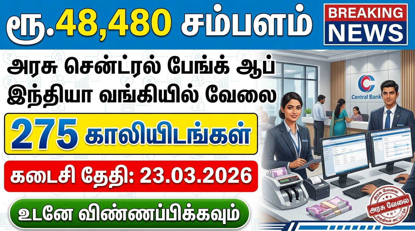 Central Bank of India Recruitment 2026: சென்ட்ரல் பேங்க் ஆஃப் இந்தியா ஆனது இந்திய அரசுக்கு சொந்தமான ஒரு பொதுத்துறை வங்கியாகும். இந்திய அரசால் தேசியமயமாக்கப்பட்ட, பழமையான மற்றும் மிகப்பெரிய வங்கிகளில் ஒன்றான இவ்வங்கி தற்போது காலியாக உள்ள 275 Specialist Officer பணியிடங்களை நிரப்புவதற்கான அதிகாரப்பூர்வ அறிவிப்பை வெளியிட்டுள்ளது. எனவே, இந்த பணியிடங்களுக்கு ஆர்வமும் தகுதியும் உள்ள விண்ணப்பதாரர்கள் 23.03.2026 தேதிக்குள் ஆன்லைன் மூலம் விண்ணப்பிக்குமாறு கேட்டுக் கொள்ளப்படுகிறார்கள். இந்த பணியிடங்களுக்கு யாரெல்லாம் விண்ணப்பிக்கலாம் கல்வி தகுதி என்ன?, விண்ணப்பிப்பது எப்படி? வயது வரம்பு எவ்வளவு? என்பது உள்ளிட்ட விவரங்களை பார்க்கலாம்.
