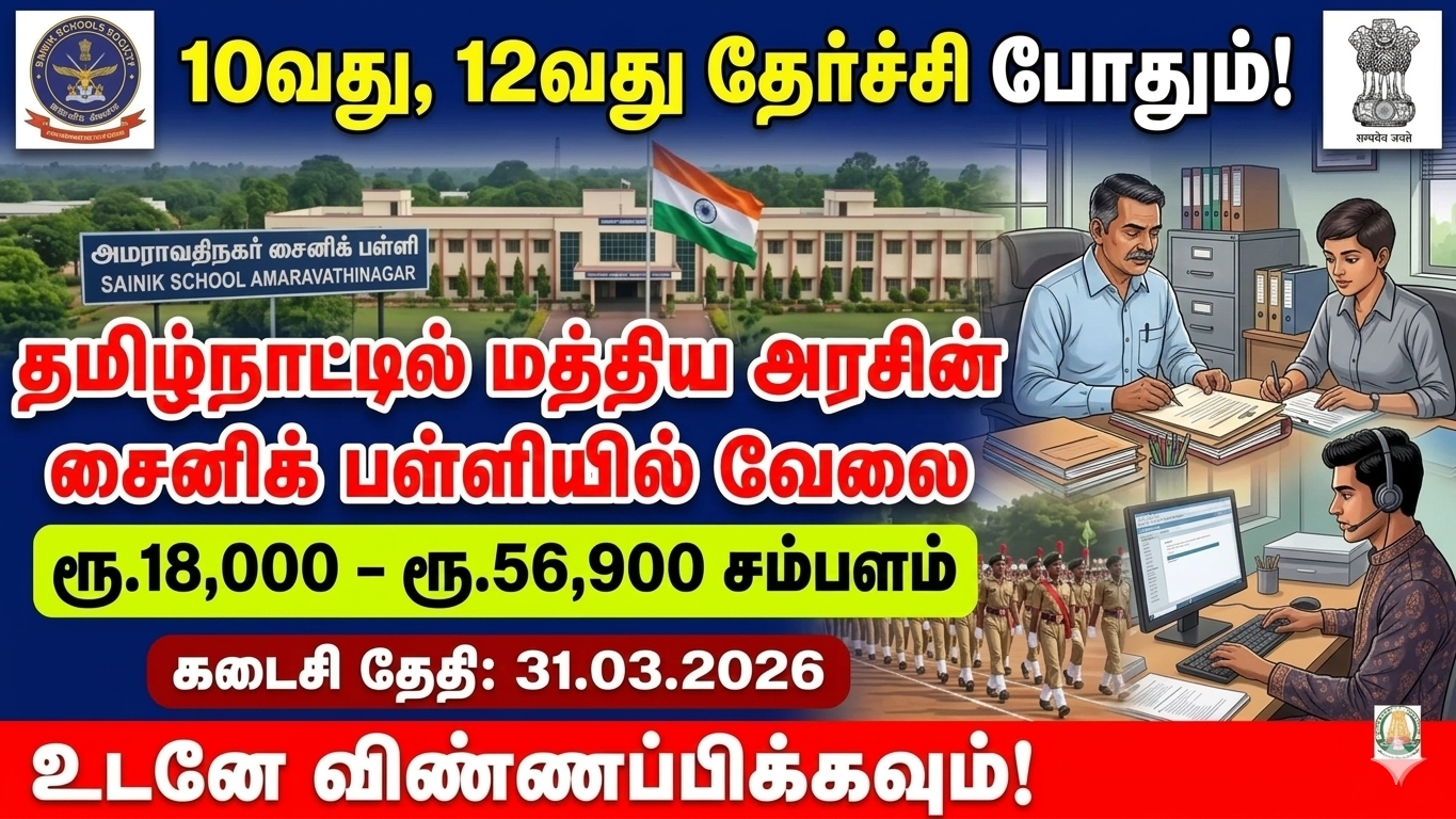 Sainik School Amaravathinagar Recruitment 2026: மத்திய பாதுகாப்பு அமைச்சகத்தின் கீழ் தமிழ்நாட்டில் திருப்பூர் மாவட்டம், அமராவதிநகரில் செயல்பட்டு வரும் சைனிக் பள்ளியில் (Sainik School) தற்போது பல்வேறு பணியிடங்களுக்கான அறிவிப்பு வெளியிடப்பட்டுள்ளது. இதில் General Employee (MTS), PEM/PTI – Matron (பெண்கள் மட்டும்) மற்றும் Ward Boys ஆகிய பிரிவுகளில் மொத்தம் 17 காலியிடங்கள் அறிவிக்கப்பட்டுள்ளன.