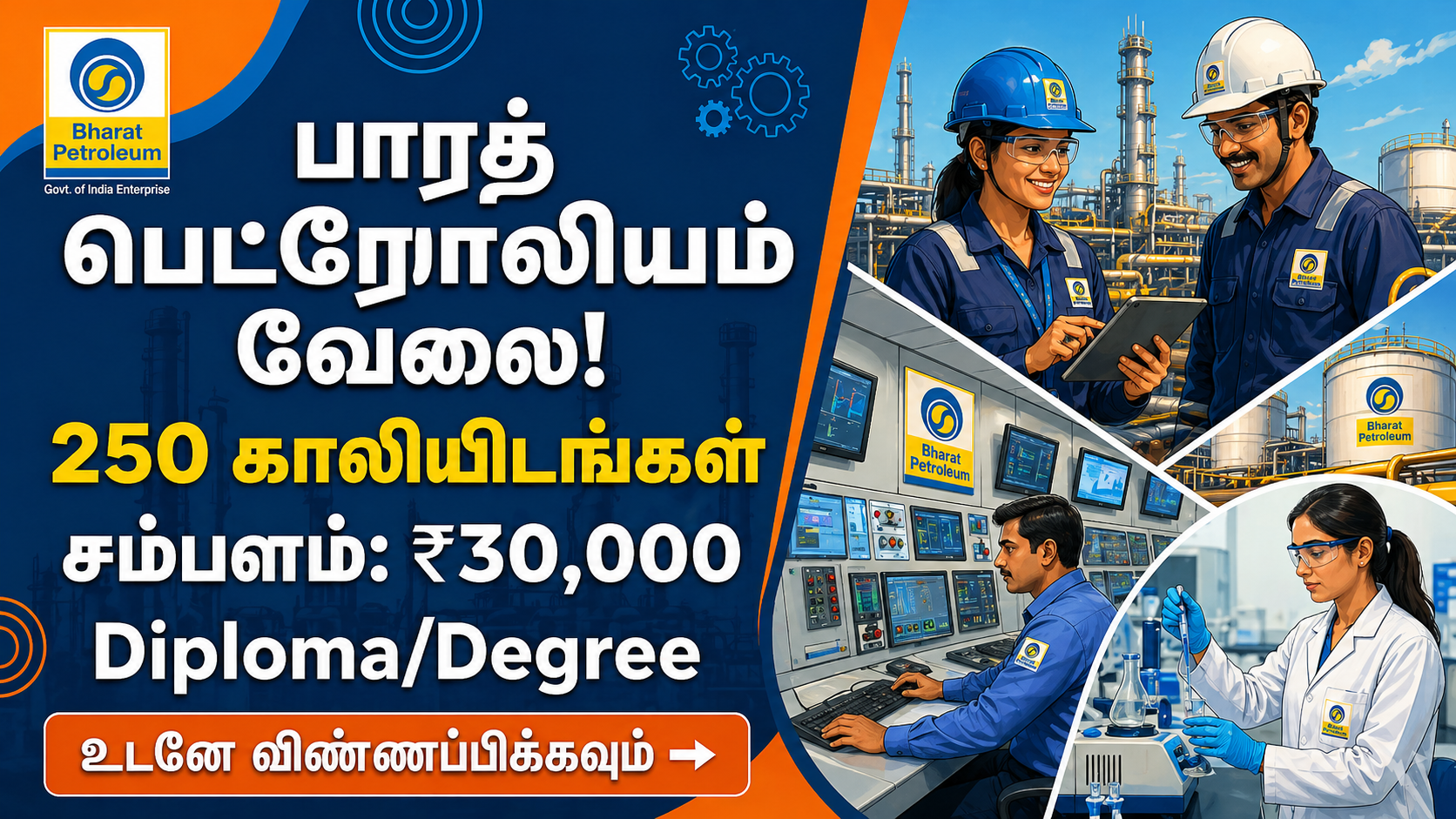 இந்தியாவின் முன்னணி பெட்ரோலிய நிறுவனமான Bharat Petroleum Corporation Limited (BPCL) நிறுவனம் 2026 ஆம் ஆண்டிற்கான புதிய வேலைவாய்ப்பு அறிவிப்பை வெளியிட்டுள்ளது. மொத்தம் 250 காலியிடங்களுடன் Junior Executive, Secretary, Associate Executive போன்ற பதவிகளுக்கு இந்தியா முழுவதும் பணியமர்த்தல் நடைபெற உள்ளது. ஆர்வமுள்ள மற்றும் தகுதியான விண்ணப்பதாரர்கள் 18.04.2026 முதல் 17.05.2026 வரை ஆன்லைன் மூலம் விண்ணப்பிக்கலாம்.