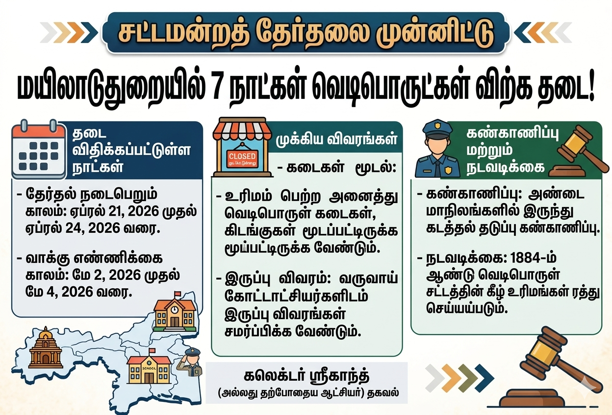 மயிலாடுதுறை: தமிழக சட்டமன்றத் தேர்தலை முன்னிட்டு, மயிலாடுதுறை மாவட்டத்தில் பாதுகாப்பு காரணங்களுக்காக மொத்தம் 7 நாட்கள் வெடிபொருட்கள் விற்பனைக்கு மாவட்ட ஆட்சியர் தடை விதித்துள்ளார்.