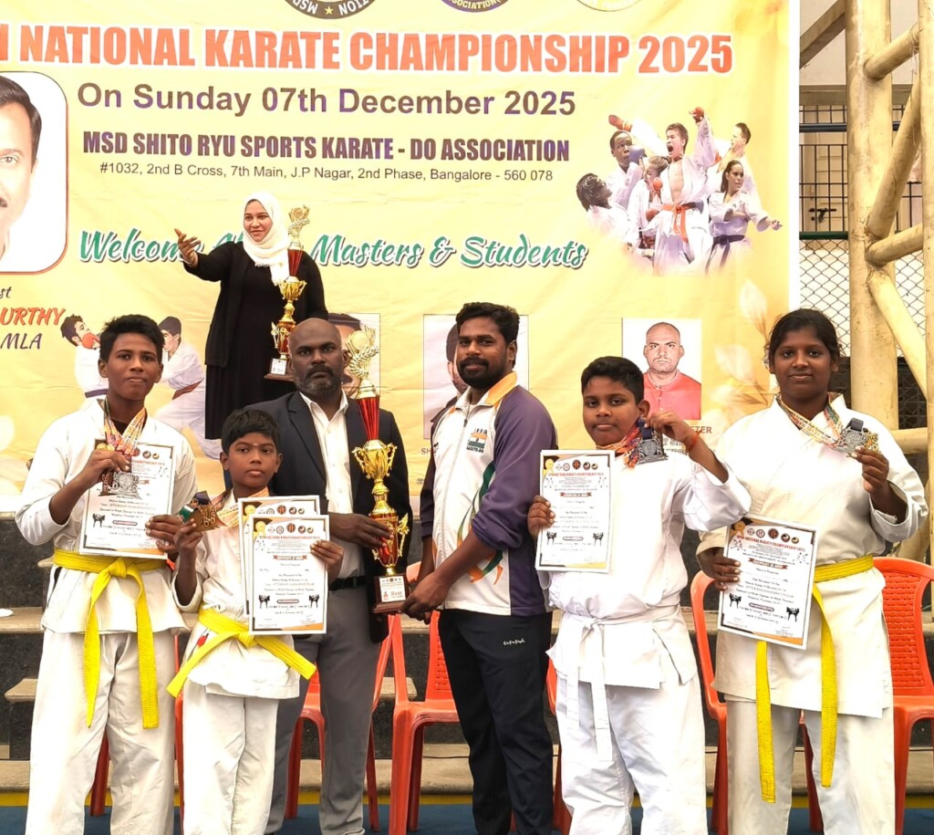 பெங்களூரில் தேசிய அளவிலான கராத்தே போட்டி கிட்டூர் ராணி சென்னம்மா உள்விளையாட்டு அரங்கில் 07.12.2025 அன்று நடைபெற்றது. இப் போட்டியில் மயிலாடுதுறை ஜென் மார்ஷியல் ஆர்ட்ஸ் அகாடமியை சார்ந்த ஸ்ரீ நிரஞ்சன் 2 தங்கம், அருண்பிரியா 1 தங்கம் 1 வெள்ளி, ஹரிவர்ஷன் 1 வெள்ளி 1 வெண்கலம் மற்றும் தர்ஷன் 1 வெள்ளி 1 வெண்கலம் என மொத்தம் 8 பதக்கங்களை வென்று மயிலாடுதுறை மாவட்டத்திற்கு பெருமை சேர்த்துள்ளனர்.வெற்றி பெற்ற மாணவ மாணவிகளையும், தலைமை பயிற்சியாளர் சென்சாய் கராத்தே கதிரவன் அவர்களையும் அகில கர்நாடகா ஸ்போர்ட்ஸ் கராத்தே சங்கத்தின் செயலாளர் பார்கவ ரெட்டி, பெங்களூர் பல்கலைக்கழகத்தின் பயிற்சியாளர் மோசஸ் பீட்டர் உள்ளிட்ட பலர் வாழ்த்தினர்.