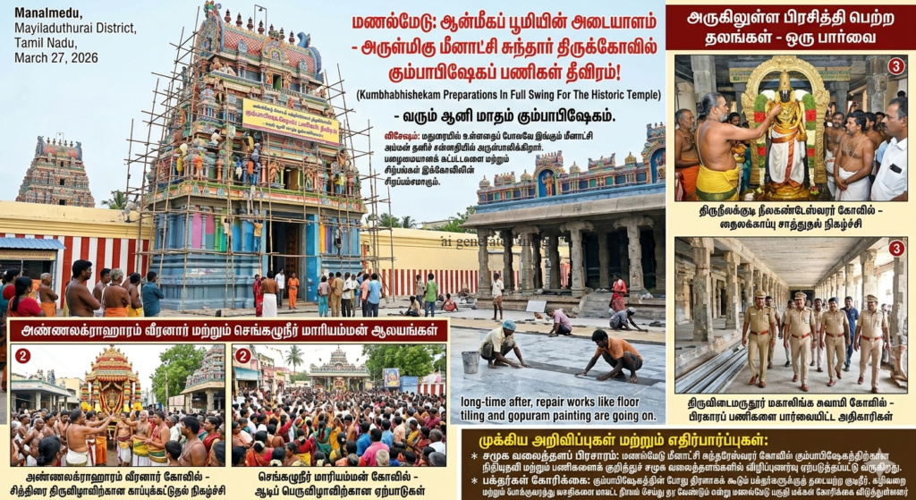 மயிலாடுதுறை மாவட்டத்தின் முக்கியமான ஆன்மீகத் தலங்களில் ஒன்றாக விளங்கும் மணல்மேடு பகுதியில் அமைந்துள்ள அருள்மிகு மீனாட்சி சுந்தரேஸ்வரர் திருக்கோவில் மற்றும் அதனைச் சுற்றியுள்ள பிற பழமையான ஆலயங்களில் தற்போது கும்பாபிஷேகப் பணிகள் மற்றும் சிறப்பு வழிபாடுகள் தீவிரமாக நடைபெற்று வருகின்றன. இது குறித்த செய்தித் தொகுப்பு: