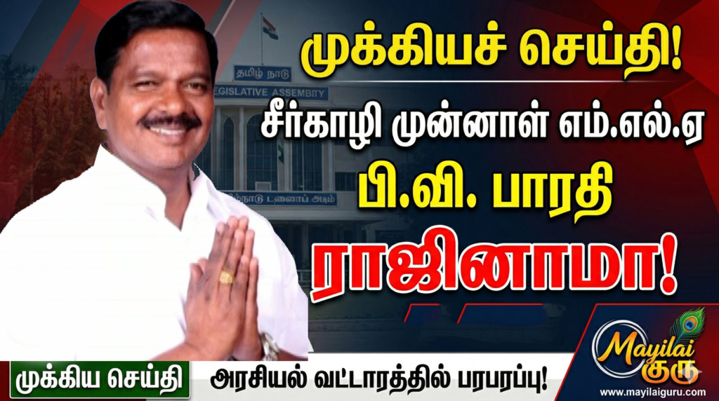 2026 சட்டமன்றத் தேர்தல் வேட்பாளர் அறிவிப்பைத் தொடர்ந்து, மயிலாடுதுறை அதிமுகவில் பெரும் பரபரப்பு ஏற்பட்டுள்ளது. சீர்காழி தொகுதியின் முன்னாள் எம்.எல்.ஏ-வும், மயிலாடுதுறை மாவட்ட கழக அவைத்தலைவருமான பி.வி.பாரதி, தனது பதவியை அதிரடியாக ராஜினாமா செய்துள்ளார்.