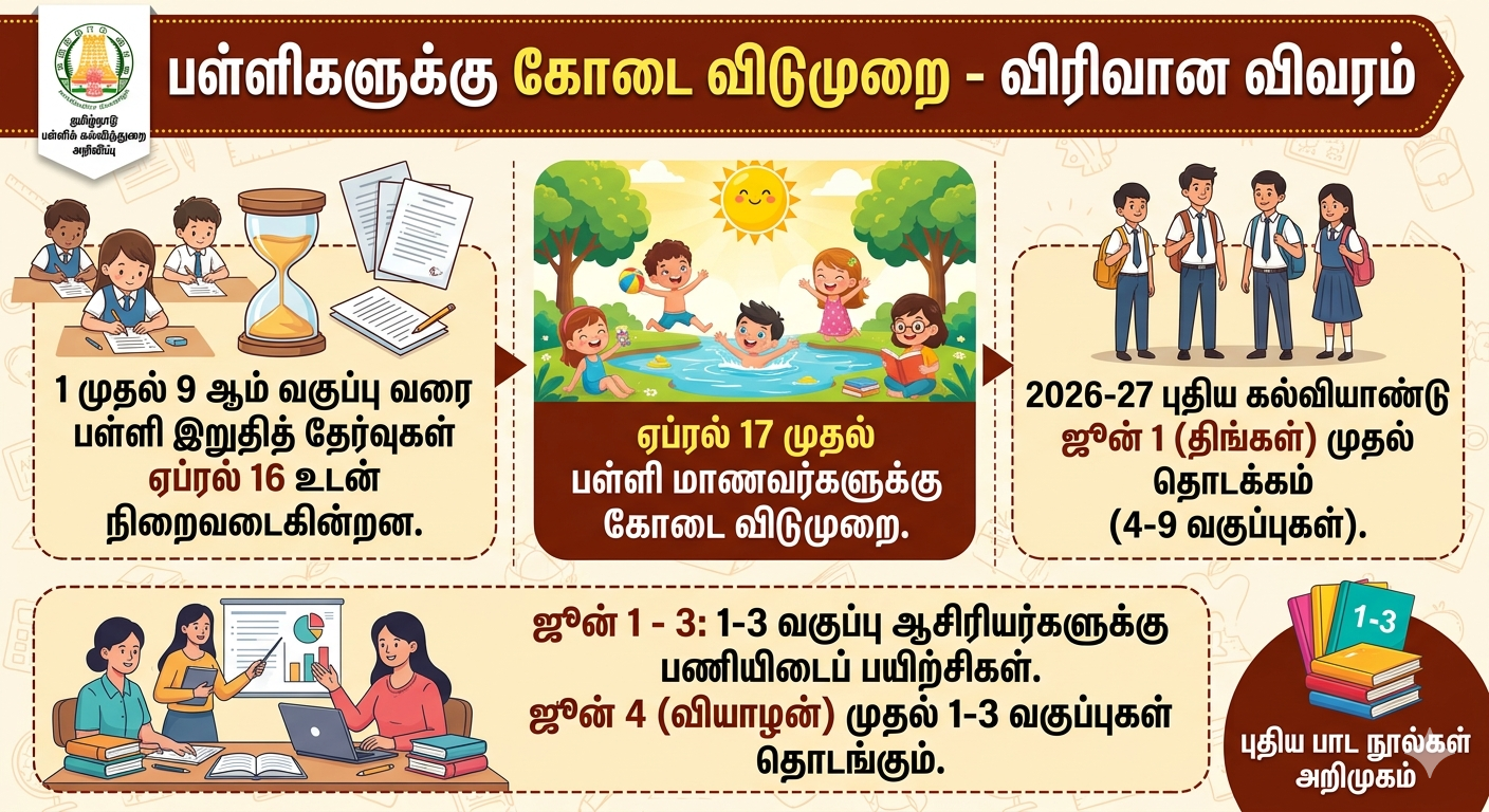 அரசு / அரசு உதவி பெறும் / தனியார் தொடக்க / நடுநிலை / உயர்நிலை மற்றும் மேல்நிலைப் பள்ளிகளில் 1 முதல் 9 ஆம் வகுப்புவரை பயிலும் மாணவர்களுக்கான பள்ளி இறுதித் தேர்வுகள் ஏப்ரல் 16 ஆம் தேதி நிறைவடைகின்றன.