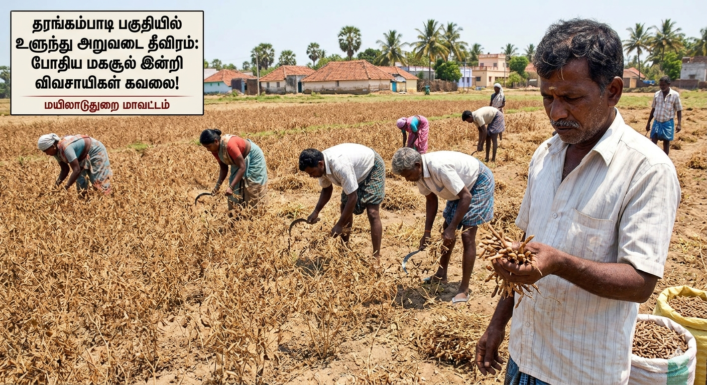 தரங்கம்பாடி | ஏப். 11: மயிலாடுதுறை மாவட்டம் தரங்கம்பாடி மற்றும் அதன் சுற்றுவட்டாரப் பகுதிகளில் தற்போது உளுந்து அறுவடைப் பணிகள் மிகத் தீவிரமாக நடைபெற்று வருகின்றன. இருப்பினும், எதிர்பார்த்த அளவு மகசூல் கிடைக்காததால் விவசாயிகள் பெரும் ஏமாற்றமடைந்துள்ளனர்.