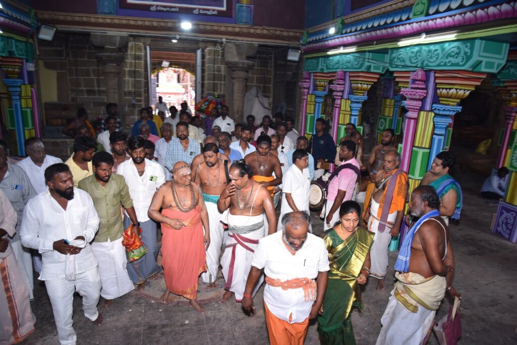 சிவாச்சாரியர்கள் தலையில் சுமந்து வேத வாத்தியங்கள் முழங்க கோயிலை சுற்றி வலம் வந்து விமான கும்பத்தை அருந்தது அங்கு வேத விற்பனர்கள் வேந்தங்கள் ஓத கோபுர கலசங்கள் மீது புனித நீர் ஊற்றப்பட்டு கும்பாசகம்